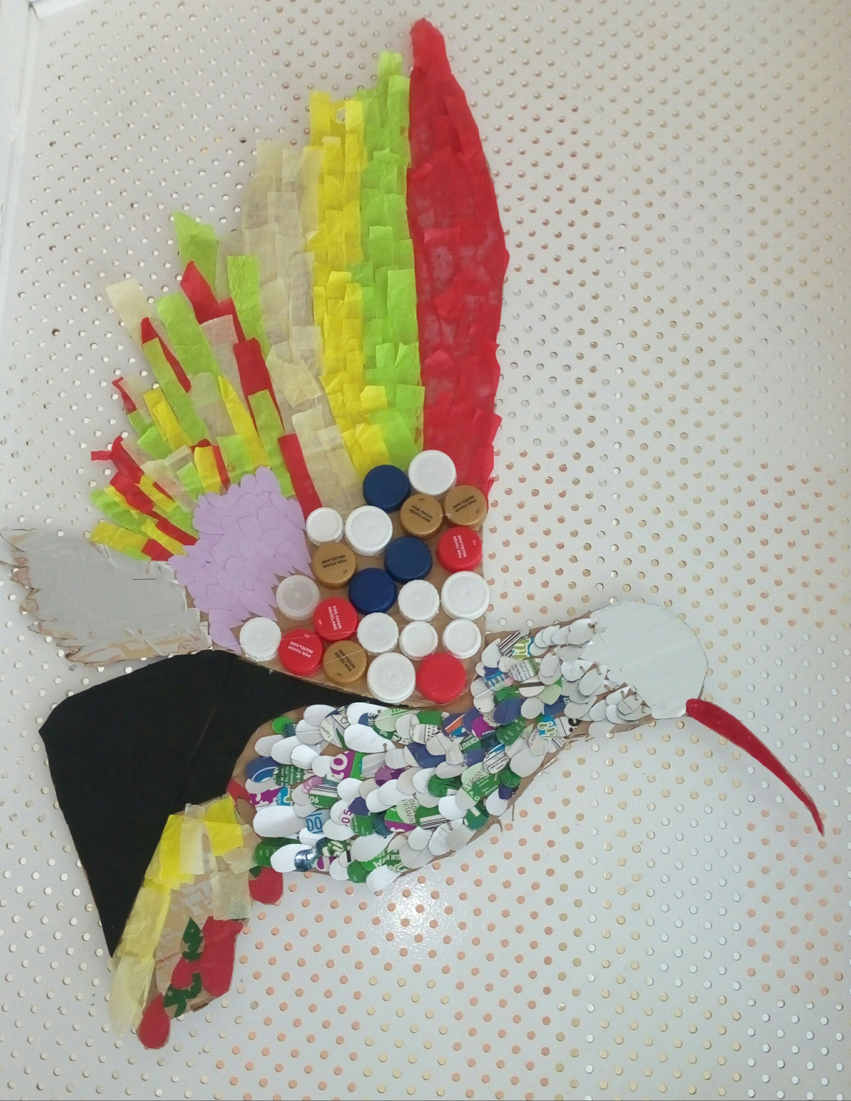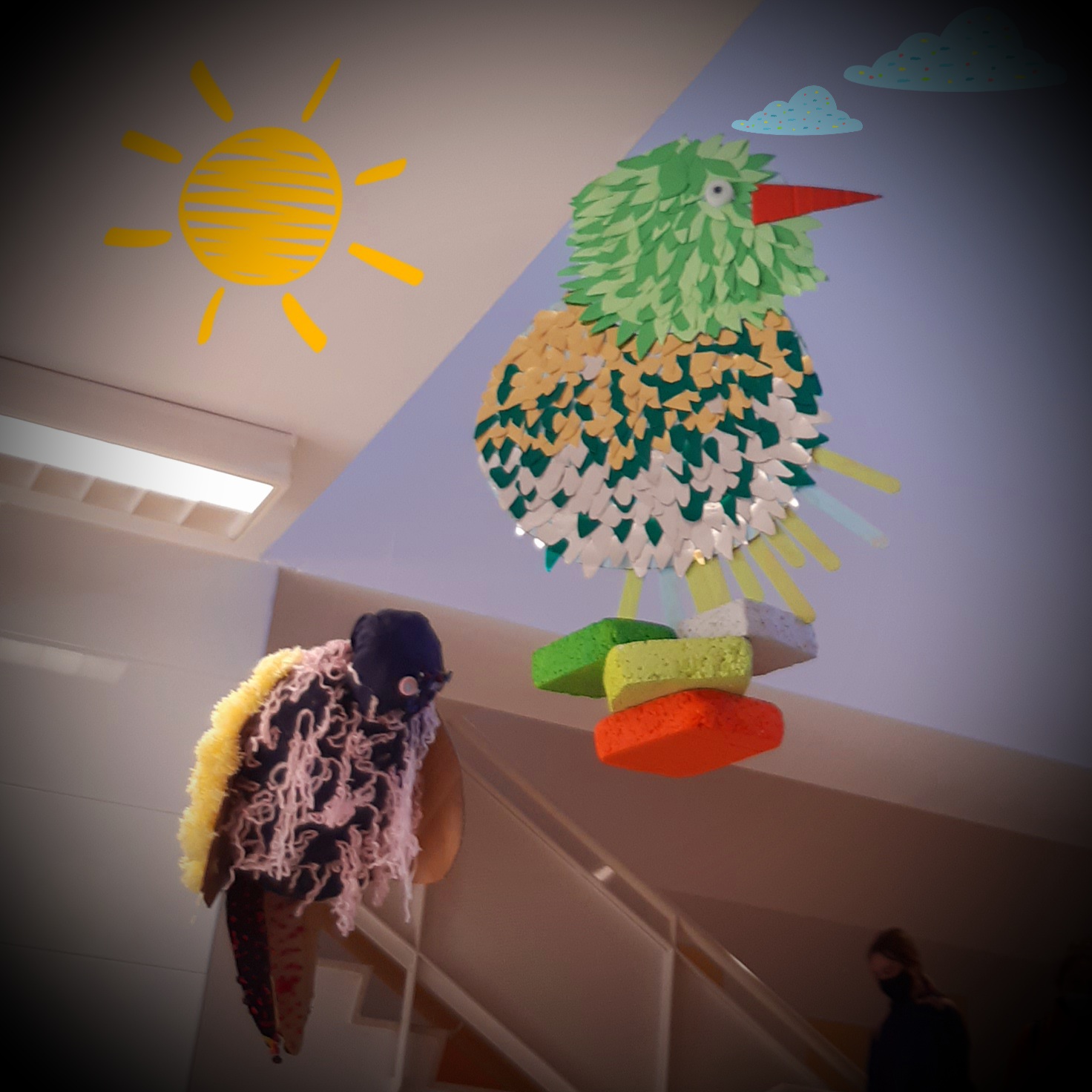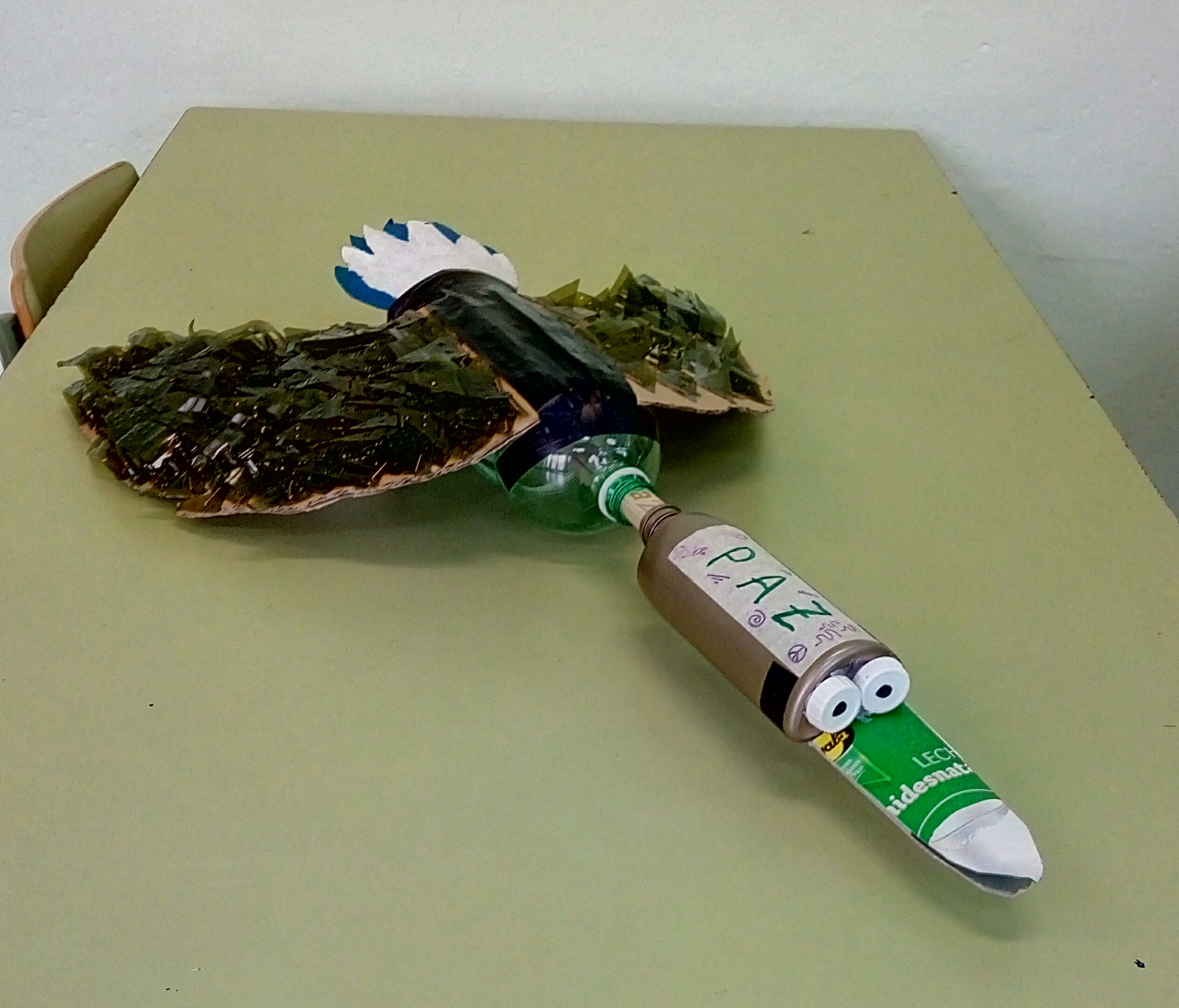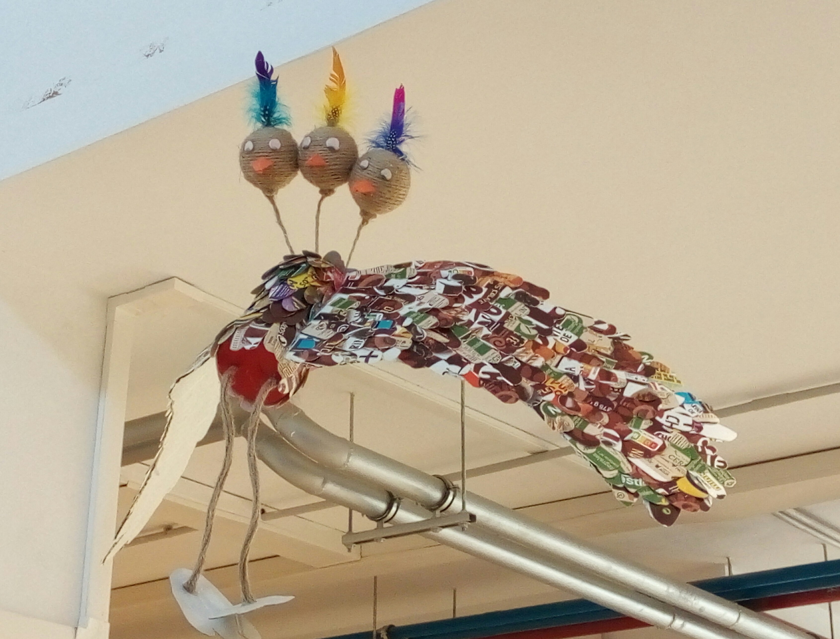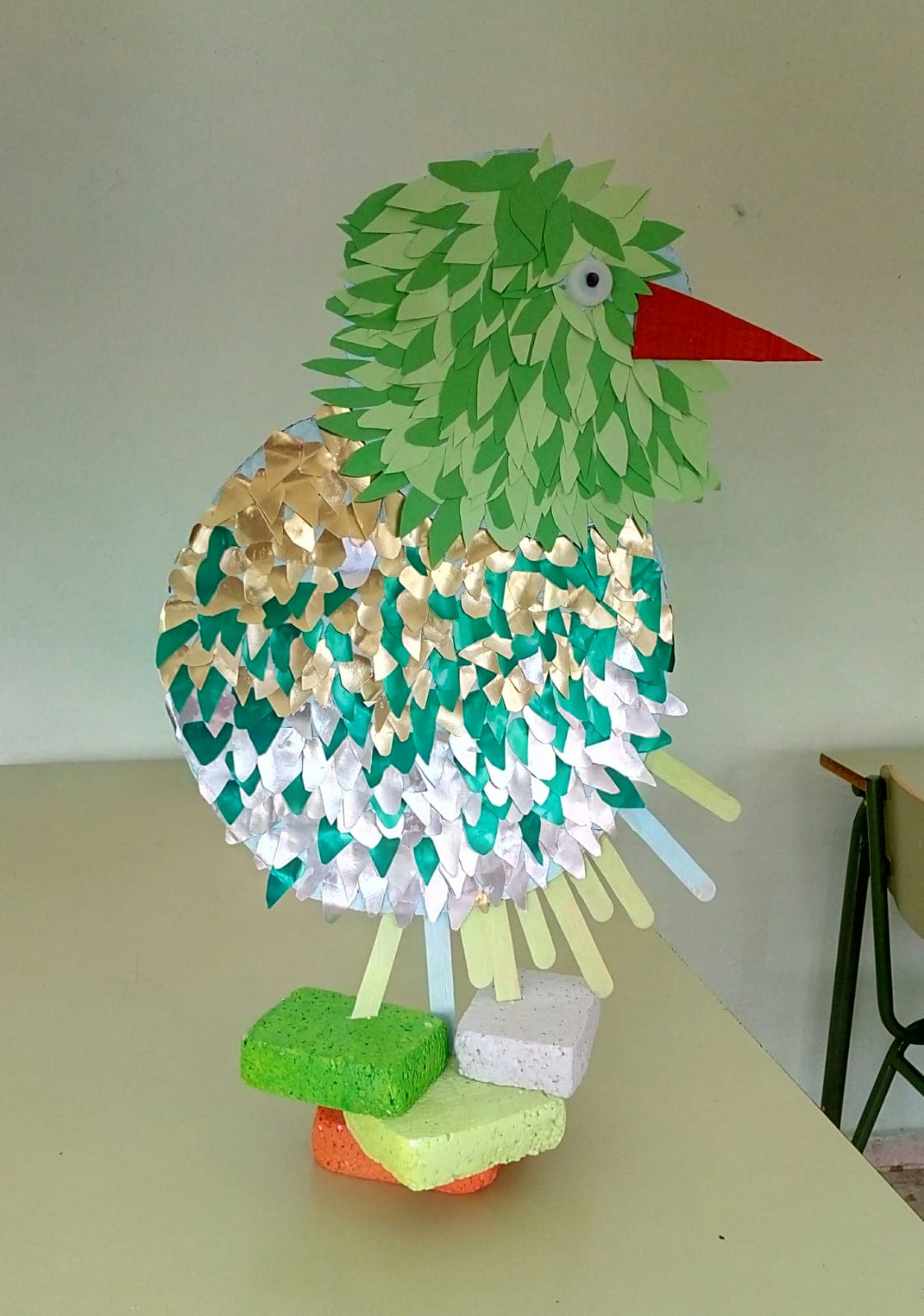 También se han realizado unos pájaros que adornan nuestras escaleras y parte del centro con materiales reciclados. Todos han sido creados en la clase de Plástica de Adriana Espinoza, nuestra compañera a la que agradecemos su colaboración.